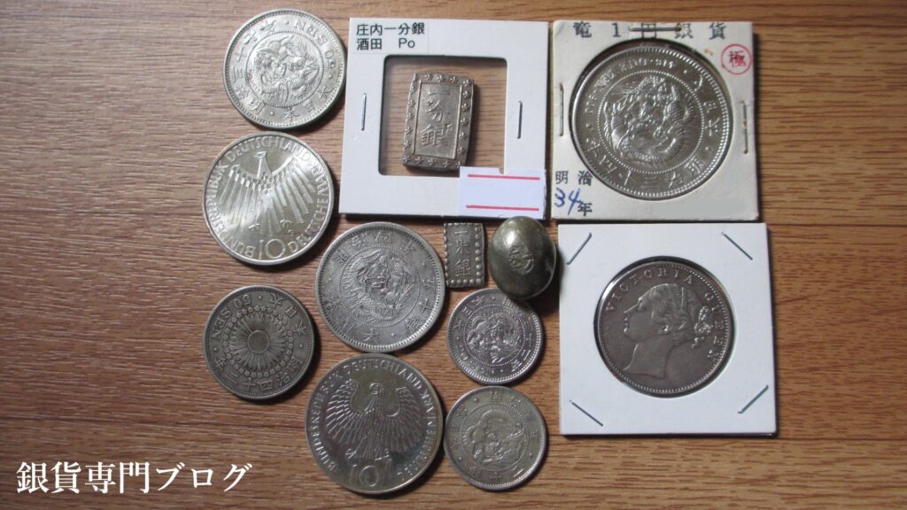 みんみんコインさんで購入した旭日竜小型50銭銀貨、旭日50銭銀貨、竜50銭銀貨、竜20銭銀貨、旭日竜20銭銀貨、新1円銀貨、嘉永一朱銀、庄内一分銀、ヴィクトリア女王 ONE RUPEE銀貨、豆板銀、オリンピック記念 10マルク銀貨詳細紹介