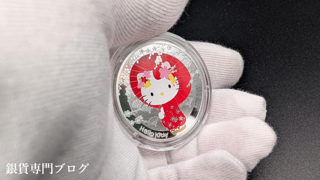 この赤い和傘をさした振袖キティは、日本をイメージした記念銀貨になります。