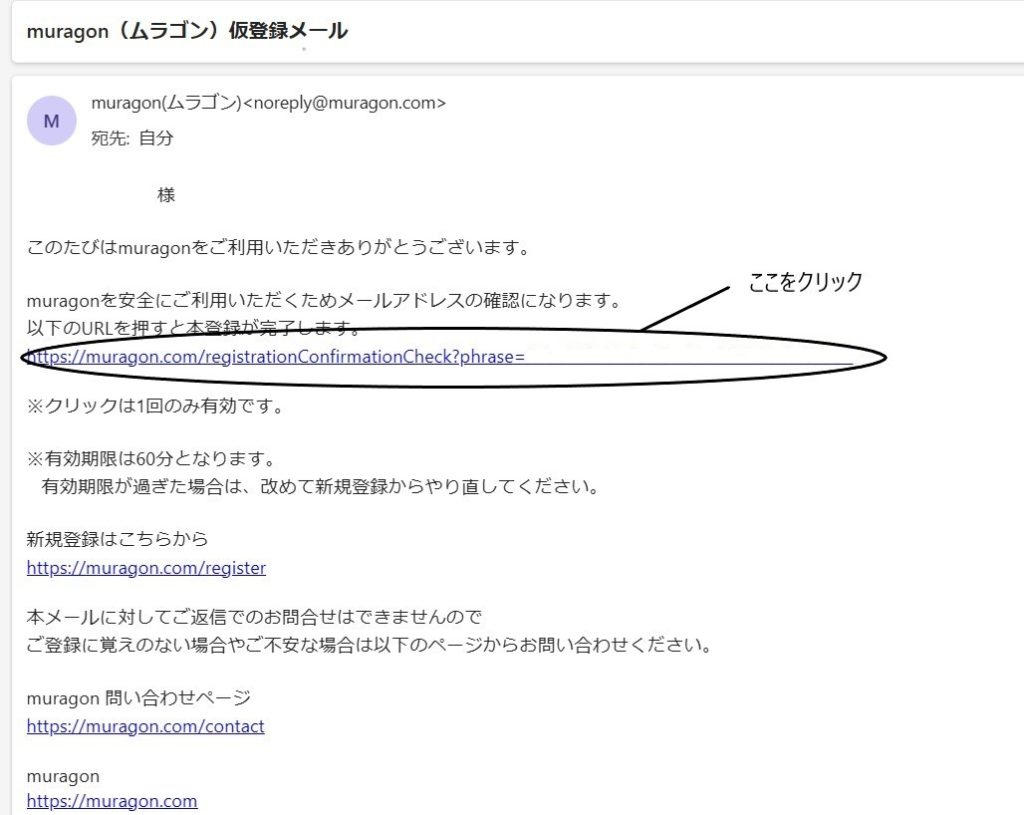 メール文の以下のURLをクリックするとムラゴンへの登録が完了となります。